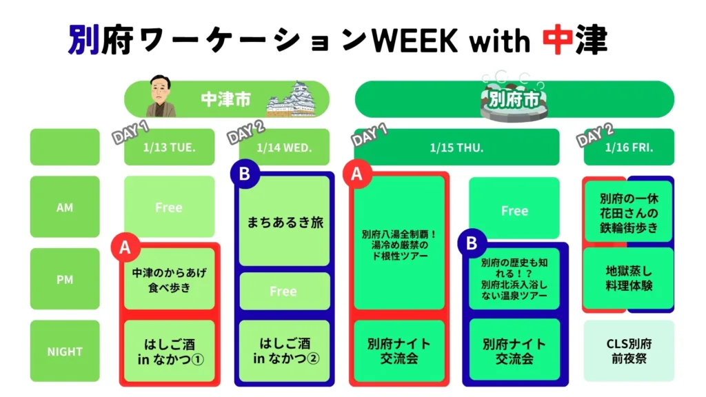 前半2日間は歴史ある中津で。後半2日間は湯のまち別府で。